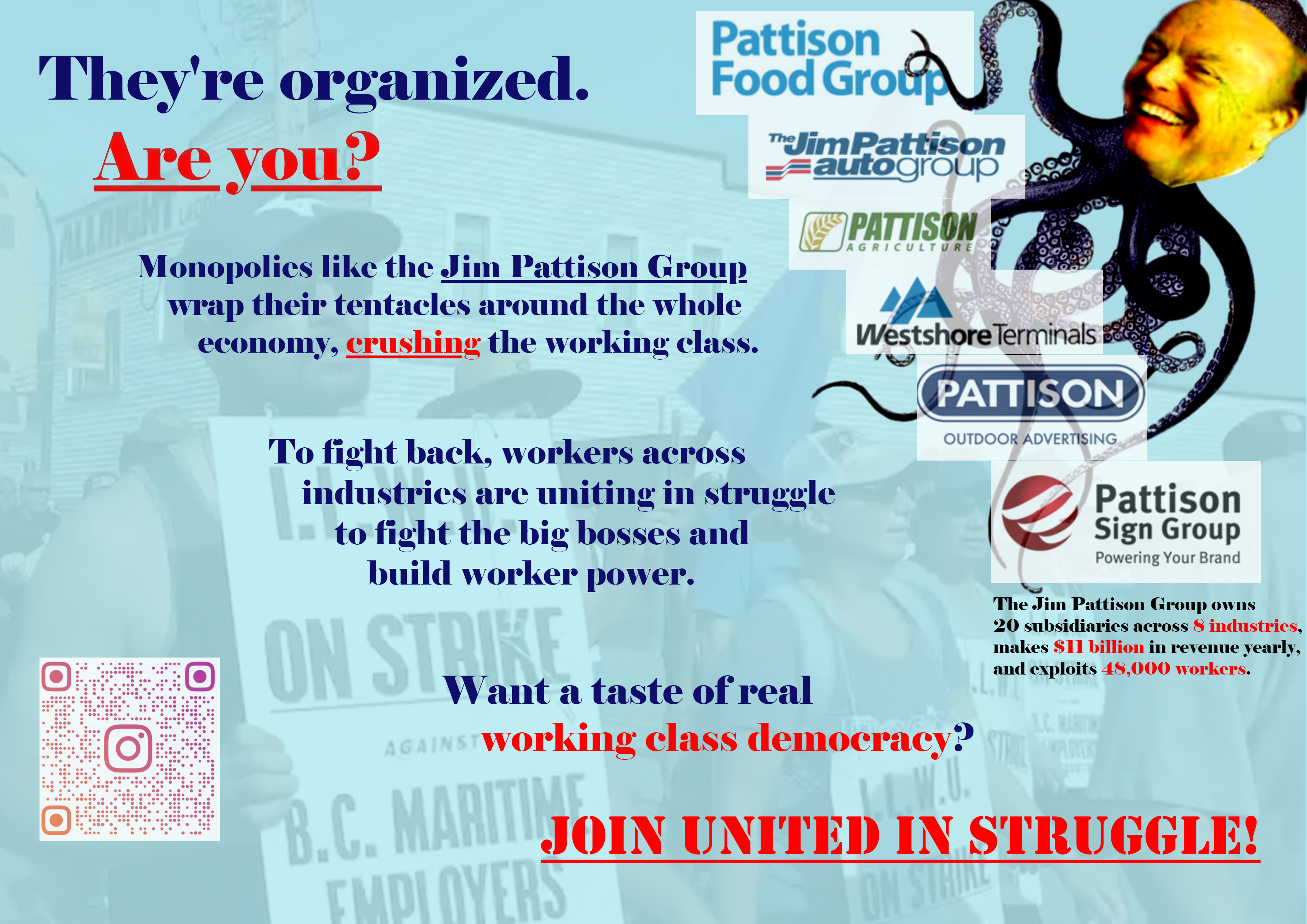 Jimmy Pattison: Save on Foods, Nesters, and Buy Low: Jimmy Pattison is often described as a ‘self-made man’. But as he grows his fortune to grotesque extremes it’s important to ask where that wealth comes from. Is it the genius of a great business man? No! Pattison profits off the backs of over 50,000 workers who do the work that makes the Jim Pattison Group one of the biggest corporations in Canada. Pattison profits and we feel the pinch of low wages and high prices. Let’s get organized and fight back.