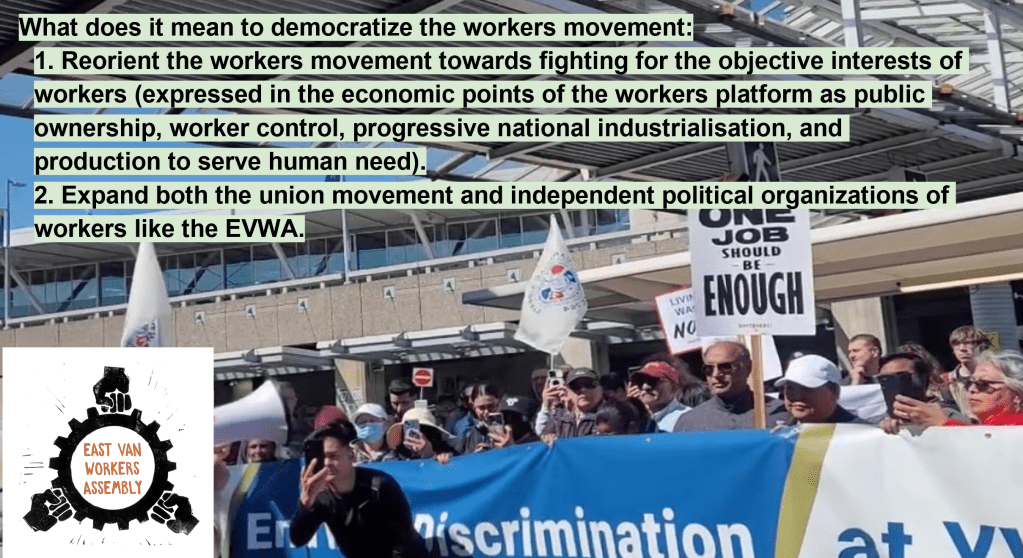 Deepening the workers movement means pushing beyond the limitations of economic struggles which often devolve into collaborative sectoral contract negotiations and cozying up to the NDP. Even our limited investigation and agitation through the EVWA reveals resentment over class collaboration and a latent desire for class struggle. We hear from workers how they tamp down their anger; there’s a hopelessness and a deep sense of resignation to the status quo when workers think there’s no point to struggle, its messy and intertwined
