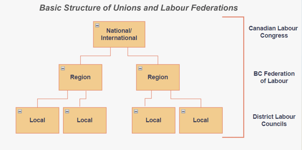 The most basic unit of a union is traditionally the bargaining unit, which is made up of all the people in a workplace or collection of workplaces who are covered by the same contract, or collective agreement. Usually, when you and your co-workers vote to unionize, you become a single bargaining unit. Next is the union local, which in most cases combines all the bargaining units affiliated with the union in a given area together. Depending on the union and the industry, there are some locals with dozens of members and there are some with thousands. Beyond that, some larger unions are divided up into regions that coordinate between the locals in their territory. For instance, the 85,000 member BC General Employees Union is broken up into 12 regions covering the province. Finally, the highest level of a union is called the national (or international, if it covers workers in more than one country).