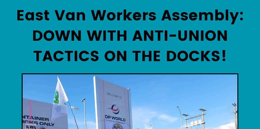 The East Van Workers Assembly (EVWA) is disgusted but not surprised by the federal government’s decision to legislate back to work over 700 locked out members of the International Longshore & Warehouse Union Local 514 in BC and 1,200 dockworkers of the Montreal-based CUPE Longshoremen’s Union, Local 375. Yet again, the government has steamrolled over … Continue reading Down with Anti-Union Tactics on the Docks!