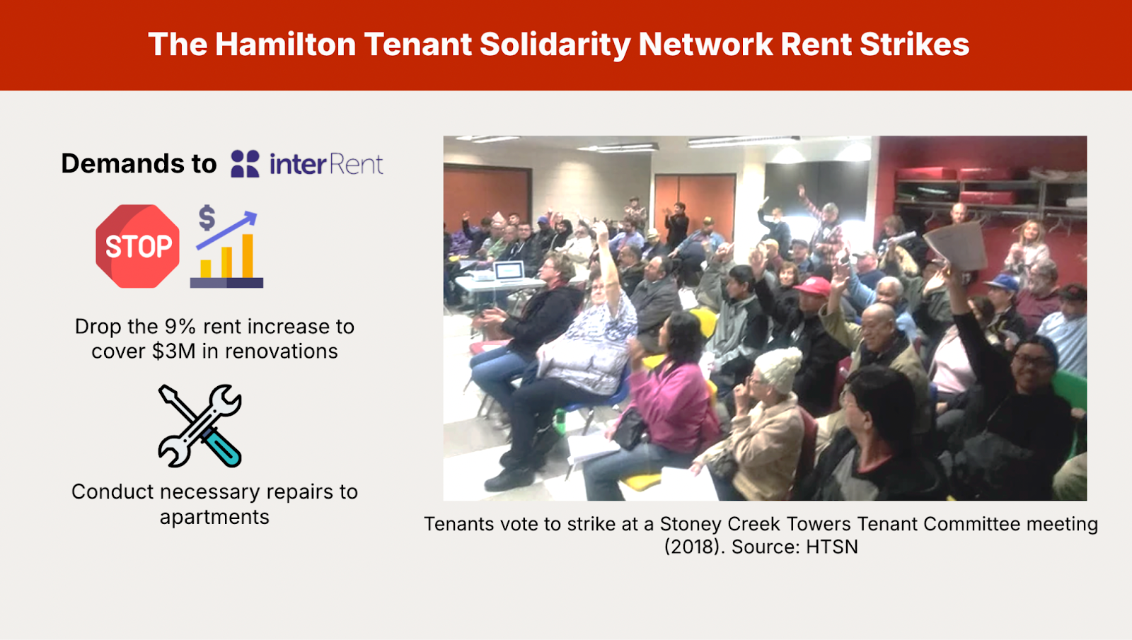 In this last example, tenants from four apartments in Hamilton, Ontario, launched a seven-month rent strike, in 2018, against their landlord, InterRent—a major Canadian real estate investment trust (REIT) . The strike demanded that InterRent: