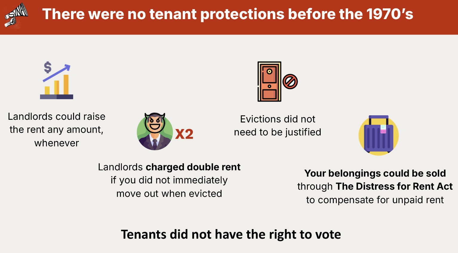 Landlords could charge double rent if the tenant did not immediately move out when evicted and sell tenants’ belongings through The Distress for Rent Act to compensate themselves for unpaid rent. Moreover, tenants did not have the right to vote in municipal elections.