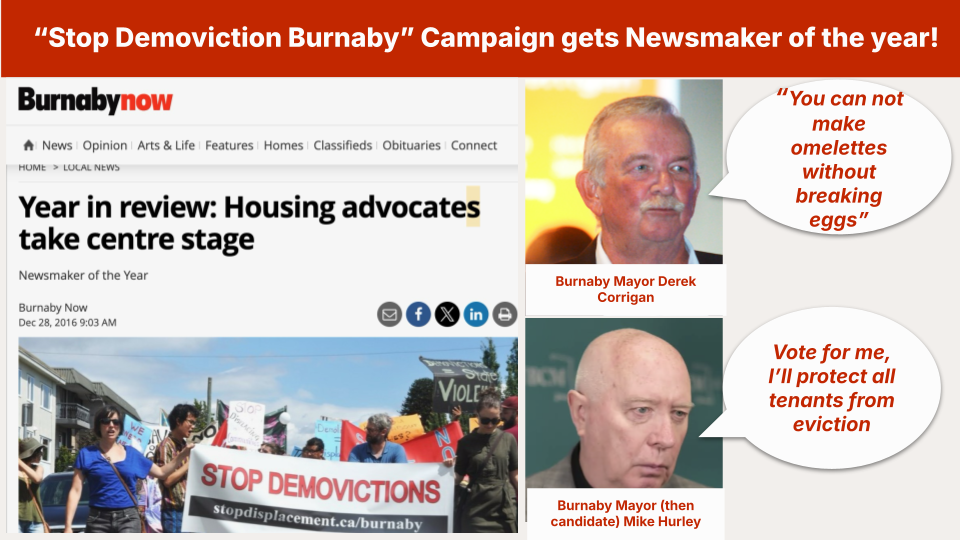 By 2018, tenant evictions were on Burnaby citizens’ minds and on every politician’s radar. Popular support was evident, Stop Demoviction Burnaby was named newsmaker of the year. Pro-development Mayor Corrigan was broadly disparaged for callously proclaiming “you can not make omelettes without breaking eggs”. His opponent Mike Hurley used the issue to win the election with a promise to protect all Burnaby renters starting with a 6 month moratorium on evictions.