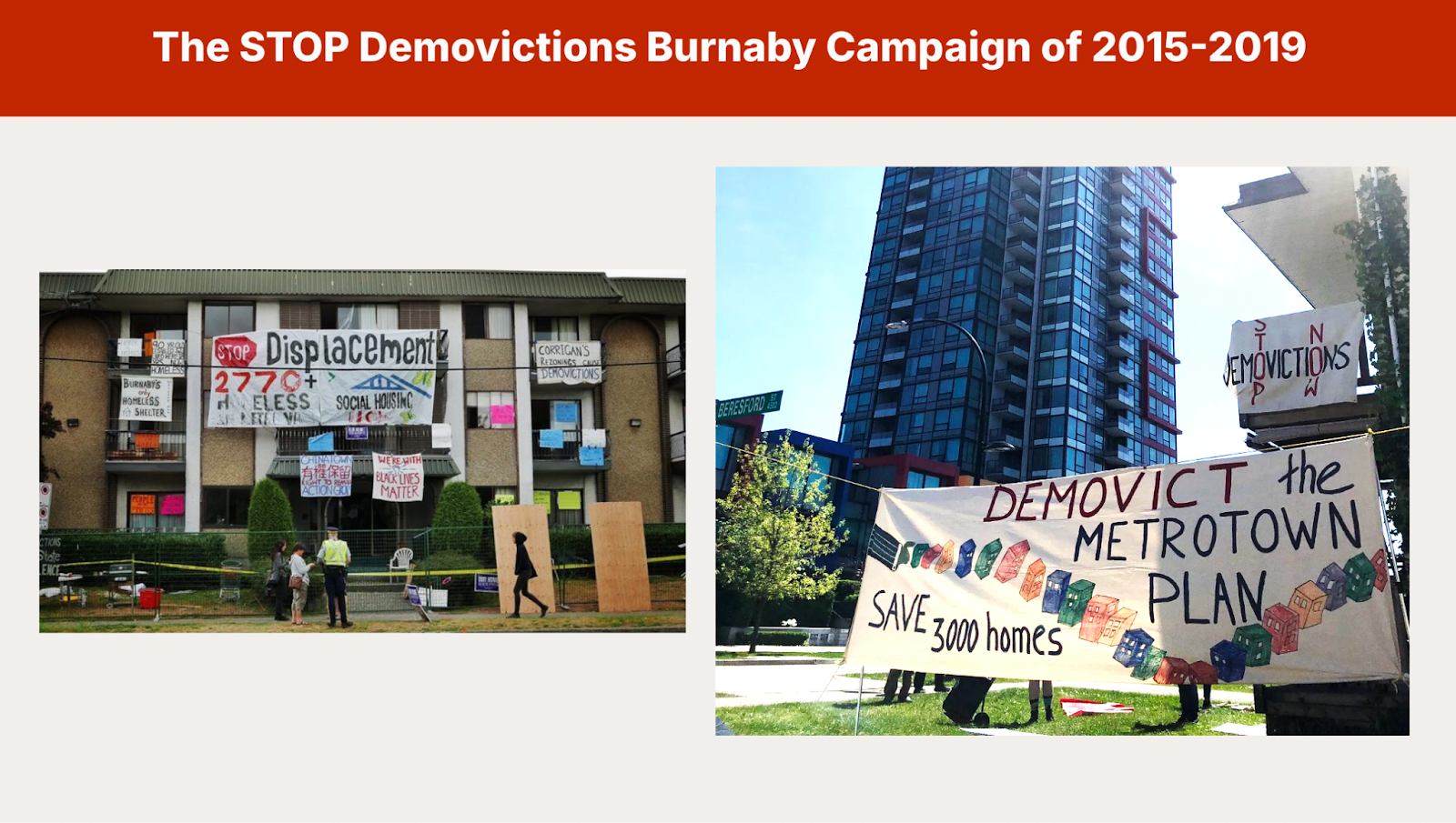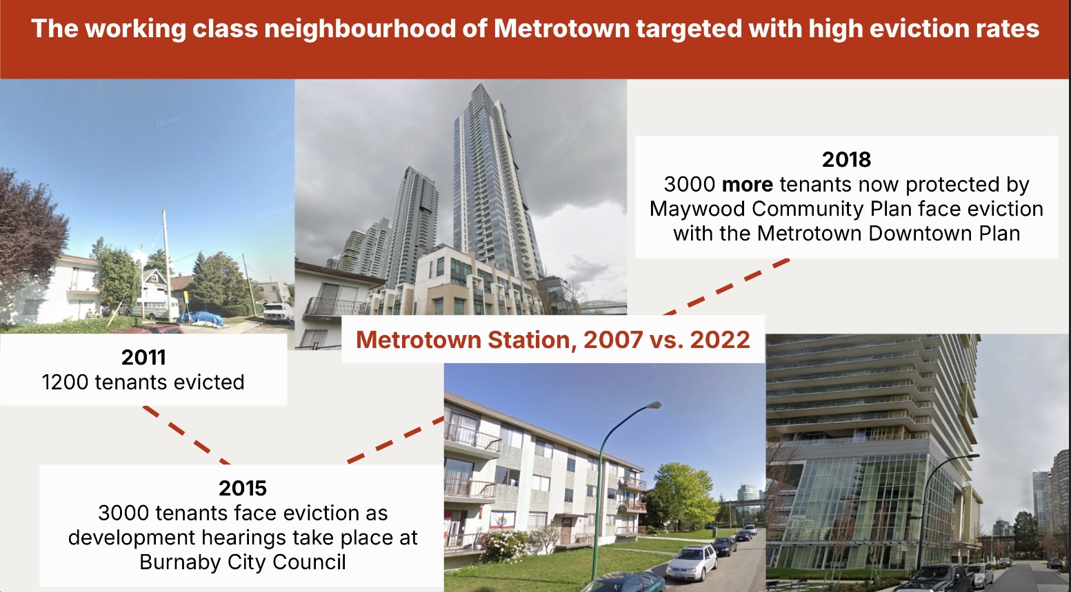 By 2011, 1200 tenants had already been evicted and by 2015, 3000 more were threatened by ongoing development permit hearings taking place at Burnaby City Council.