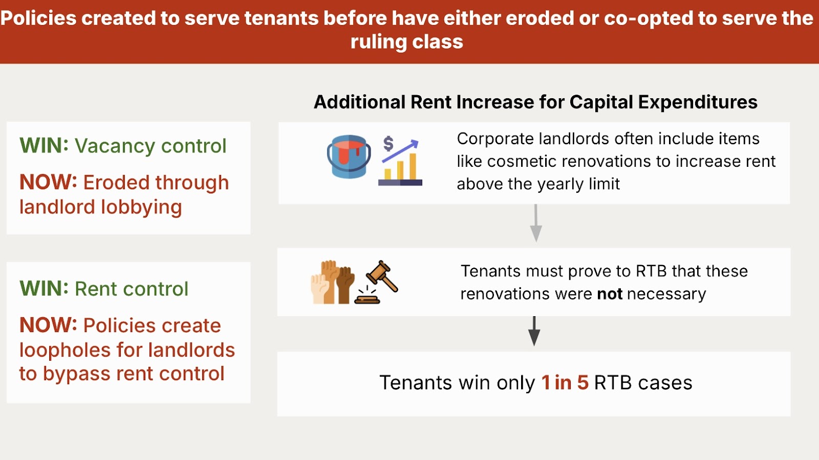 First, vacancy control from the 1970s tenant movement has been completely eroded by landlord lobbying. Nowadays, once a tenant moves out (or is evicted), landlords can increase rent for the next tenant with no restrictions. We see this often being used today as an excuse for landlords to evict tenants, to charge higher rent for their next tenant.
