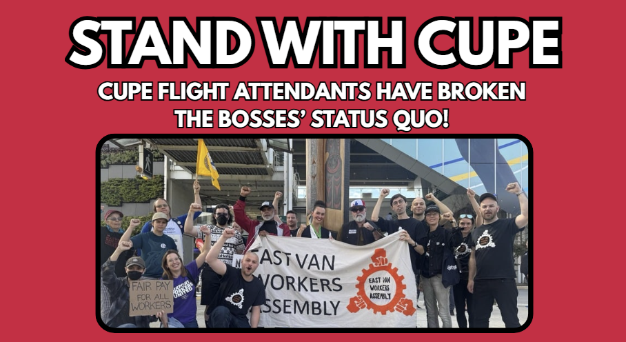 The East Van Workers Assembly (EVWA) proudly stands with the 10,517 CUPE flight attendants on strike who have already scored a major victory for the entire working class by defying the bosses at Air Canada and the federal government’s vile and unconstitutional back to work order!
